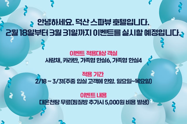 덕산 스파뷰호텔 - 메인으로 이동 SPA VIEW 호텔소개 오시는길 ROOMS 디럭스 패밀리 스탠다드 글램핑(온돌카라반) 가족탕한실 사랑채 FACILITIES 골프존파크 야외 글램핑장 찜질방 식당 건식사우나 4층 워터랜드 헬스장/편의점 기타부대시설 TRAVEL COMMUNITY 공지사항 스파뷰 체험기 언론 속 스파뷰 갤러리 묻고답하기 자주하는질문 이벤트 PR 영상 PARTNER 예약바로가기 Korea English close 12.0 HOTEL SPAVIEW NOTICE 스파뷰호텔 공지사항입니다. 언제나 고객의 입장에서 생각하고 함께하는 스파뷰호텔이 되겠습니다. 2026년 객실 이벤트 안내 2026.02.13 목록가기
